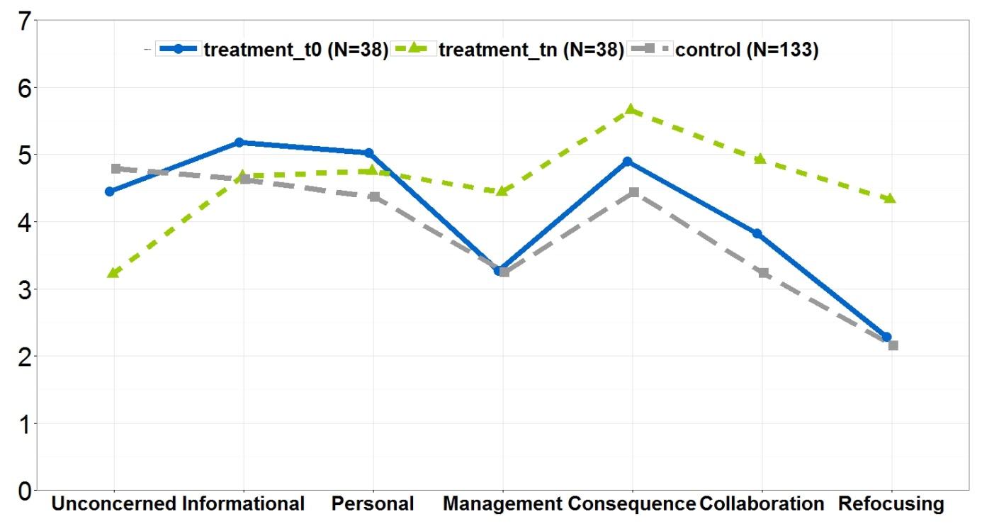 As análises pré-pós dos dados, bem como a comparação dos resultados do tratamento e do grupo-controlo, mostram que de acordo com os PROFILES SoC de Bitan-Friedlander, Dreyfus e Milgrom (2004), os professores estagiários do nosso grupo de tratamento desenvolveram de um modo mais “positivo” e mais aberto, com atitudes relacionadas com o IBSE, no final dos nossos cursos de CPD (ver Figura 1).